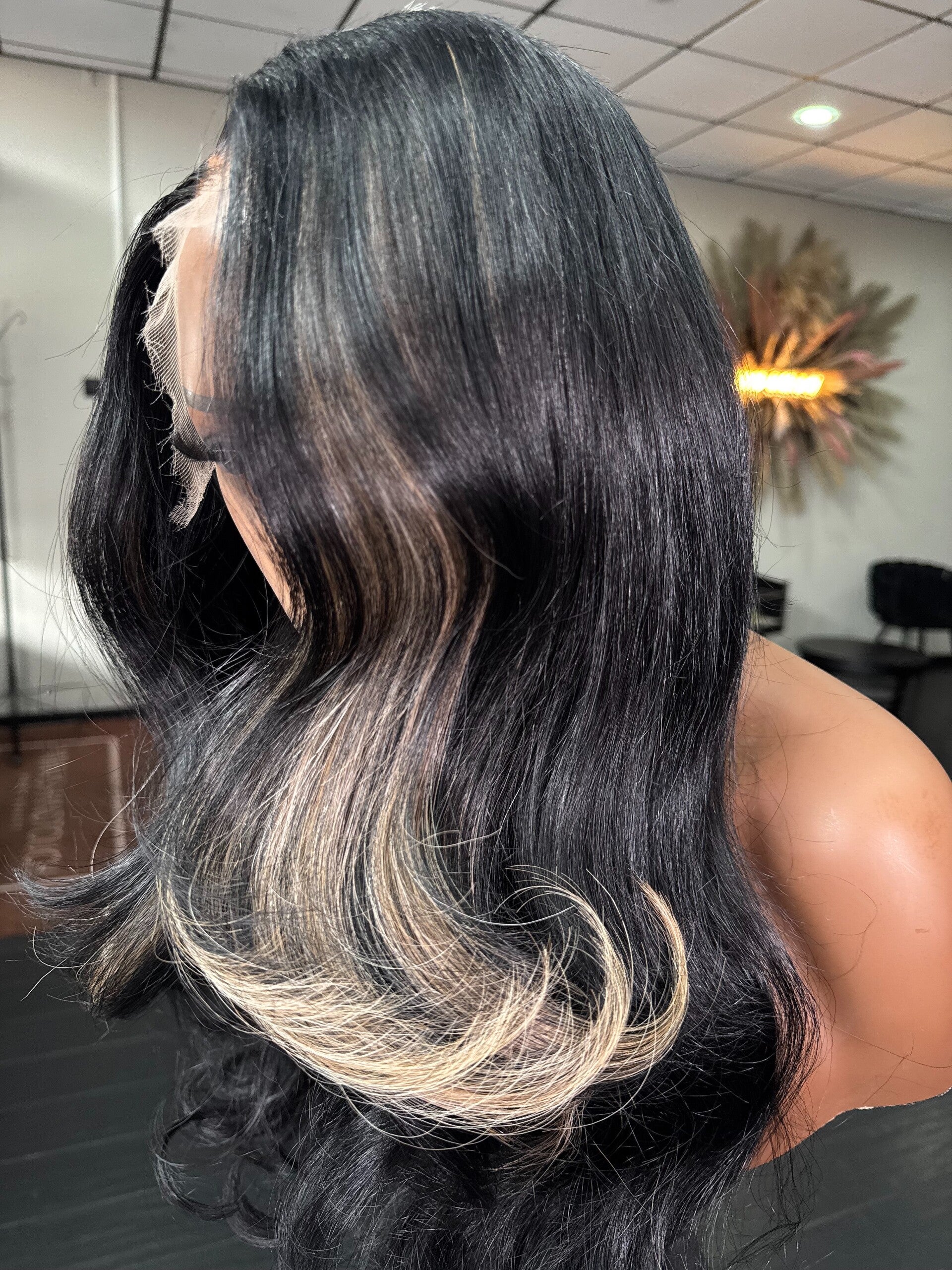 This 20" black side part wig contains a 6x6 HD closure and 3 bundles with a few pre-highlighted streaks in the frontal only.